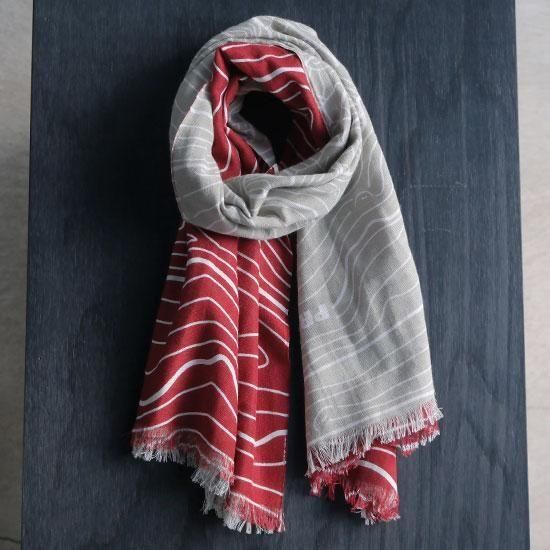 群馬県の谷川岳(ライトグレー)と赤城山(レッド)の等高線でデザインされたコンツアーストールプロは、二重の生地を片面ずつ色を変え、熟練した職人の手により捺染(プリント)しています。そのため、他ではマネのできない製品になっています。